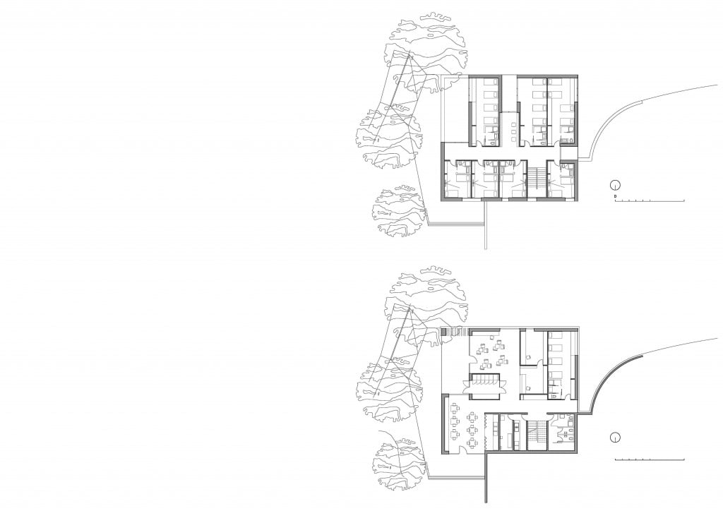 Kompakten lesen stavbni volumen je subtilno umeščen na padajoč teren. Z oblikovanjem vhoda in teras se v notranjosti ustvarjajo razgibani in svetli prostori. Dostop je urejen preko pešpoti, ki nas zlagoma vodi do vhodne terase med obstoječima visokoraslima drevesoma. V pritličju se nahaja vhodni skupni prostor s turistično info točko, prostori za druženje gostov, servisni prostori in soba prilagojena za bivanje invalidov. V skupnih prostorih, z izhodom na pokrito vhodno teraso in teraso jedilnice, se prirejajo potopisna predavanja, izobraževanje mladih, glasbene delavnice ipd. Ležišča za goste so organizirana v osmih sobah z lastnimi kopalnicami v katerih lahko prenoči do 48 gostov.